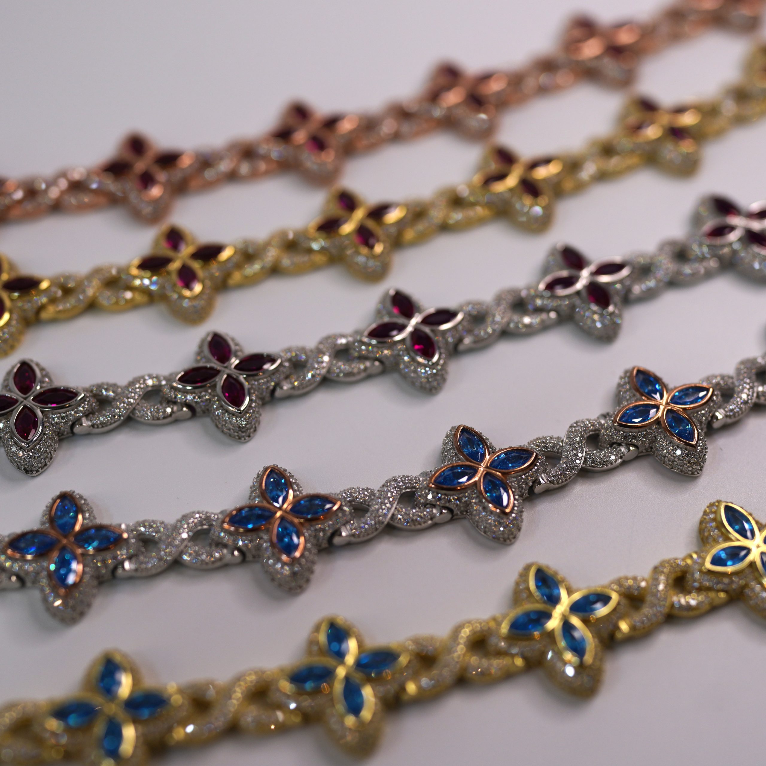 This beautifully crafted bracelet is made from premium 925 sterling silver and designed with a unique cross pattern. Each motif features deep blue marquise stones in the center, surrounded by a fully iced halo of VVS moissanite stones that deliver exceptional brilliance and pass the diamond tester. The alternating moissanite links create smooth movement and enhance the bracelet’s luxurious shine. With every turn of the wrist, the piece reflects the signature Diamond Dancing sparkle effect. Perfect for elegant occasions or elevating daily style with a touch of color and luxury.