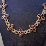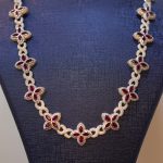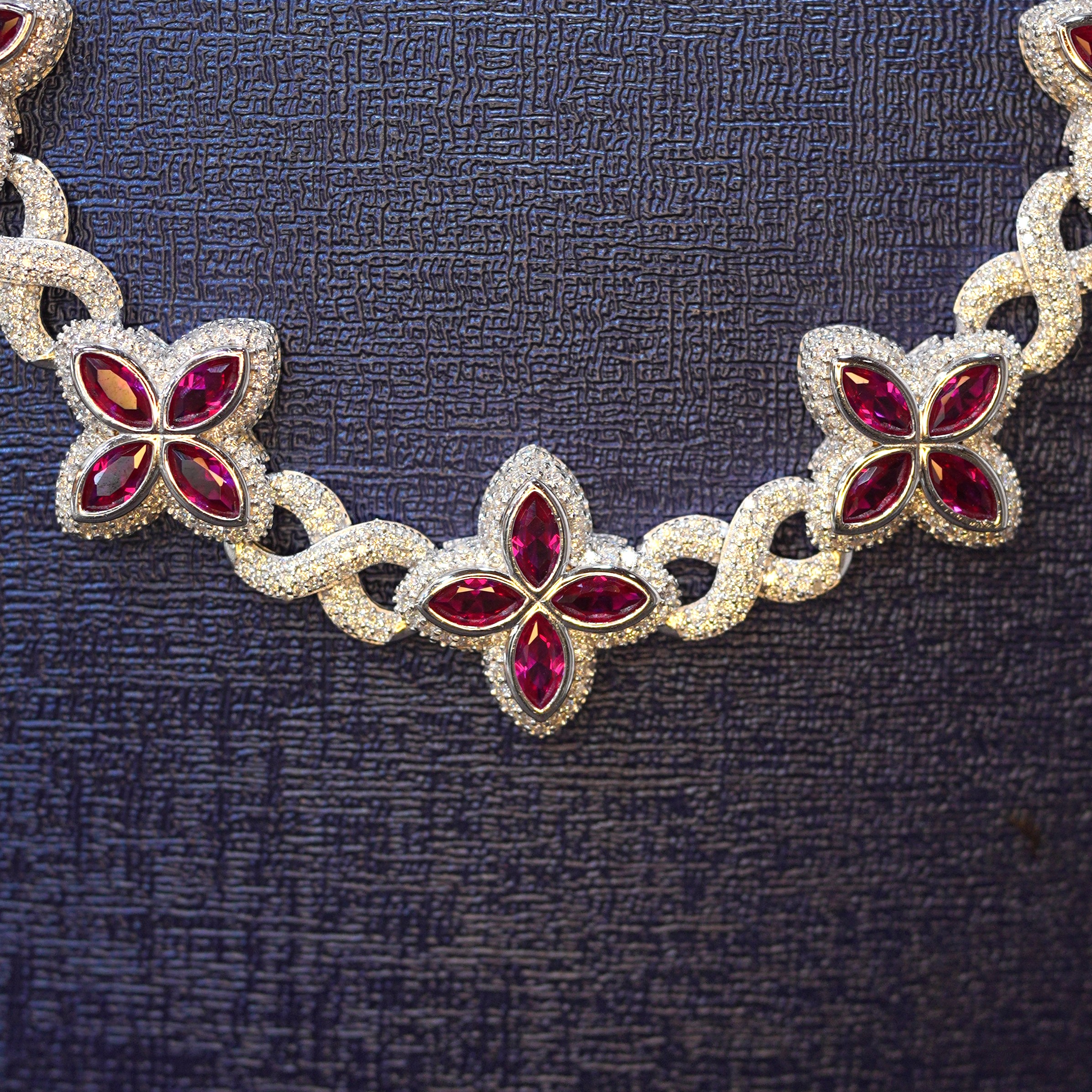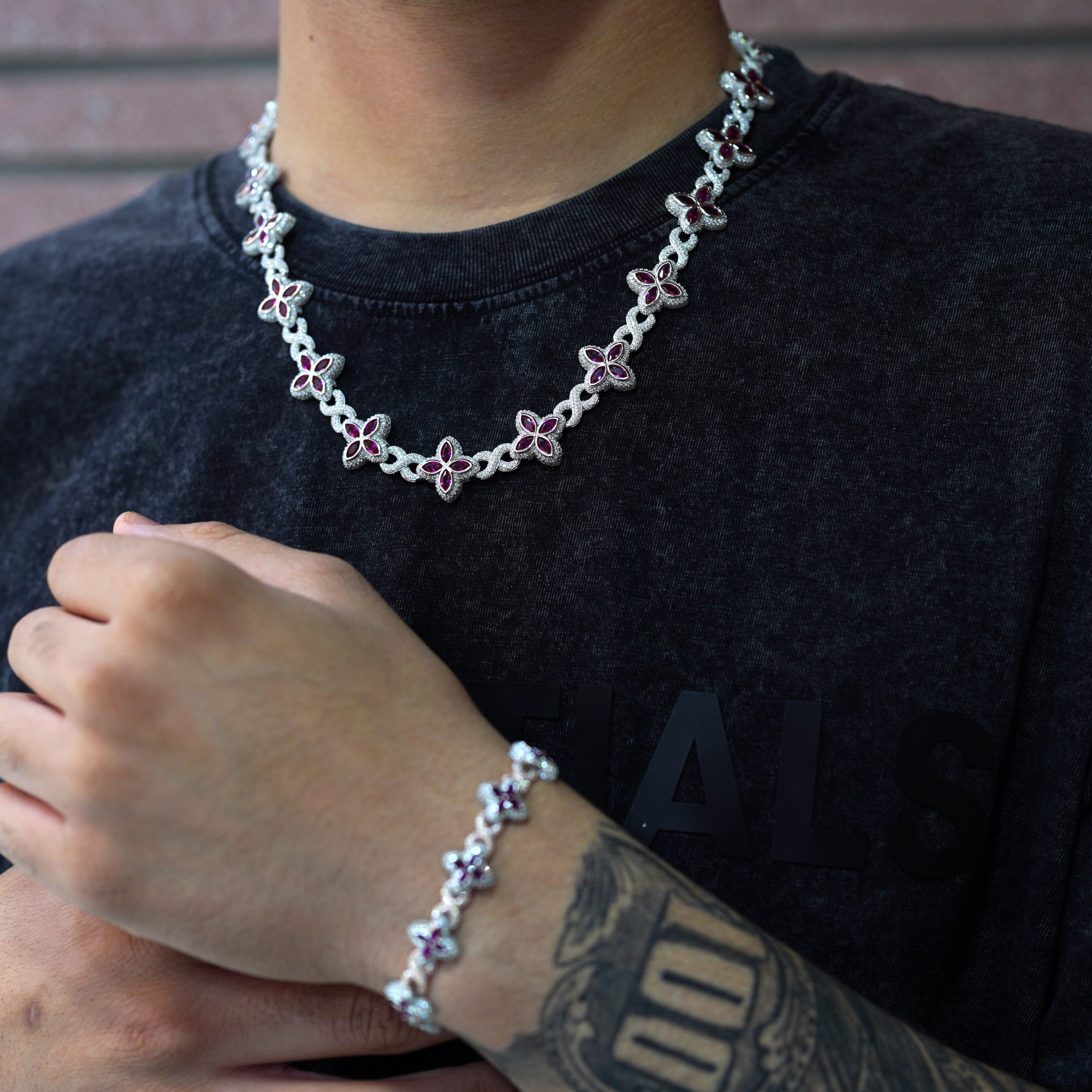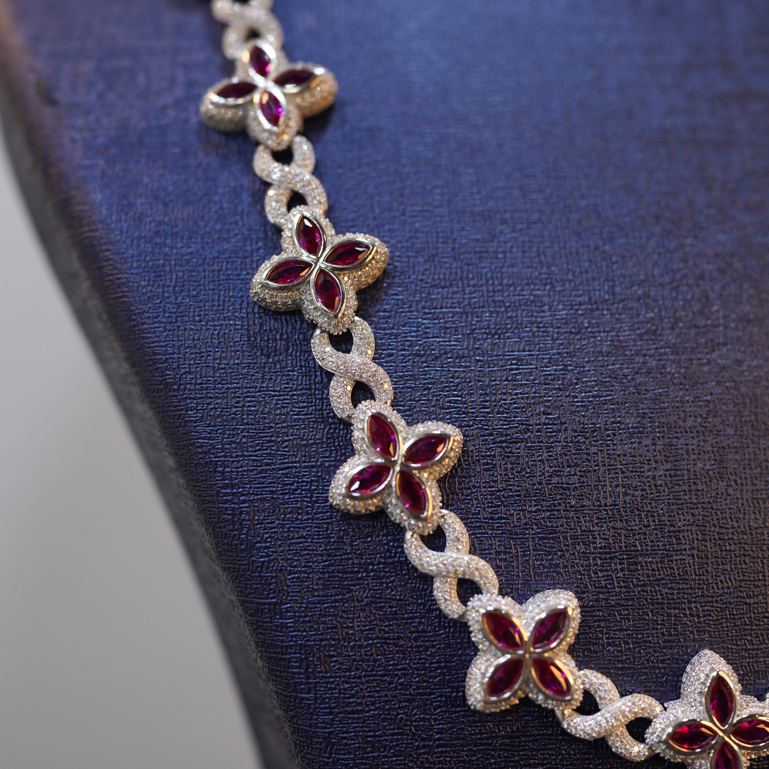 This refined Diamond Dancing Clover Link Chain features a beautifully detailed design with alternating clover-shaped links accented by rich red enamel centers. Each clover is meticulously surrounded by VVS D-color moissanite stones that pass the diamond tester, ensuring a radiant and authentic diamond-like brilliance. Crafted with precision in high-quality 925 silver, this chain combines luxury, artistry, and timeless charm. The elegant contrast of red and white sparkle makes it a standout piece from Dreams Jewelry & Diamond Dancing, perfect for those who appreciate unique sophistication.