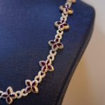 Elegant clover link moissanite chain with red enamel details. Each clover is surrounded by VVS D-color moissanite stones that pass the diamond tester, showcasing the signature sparkle of Diamond Dancing.