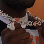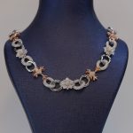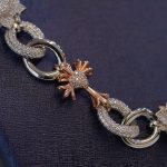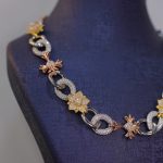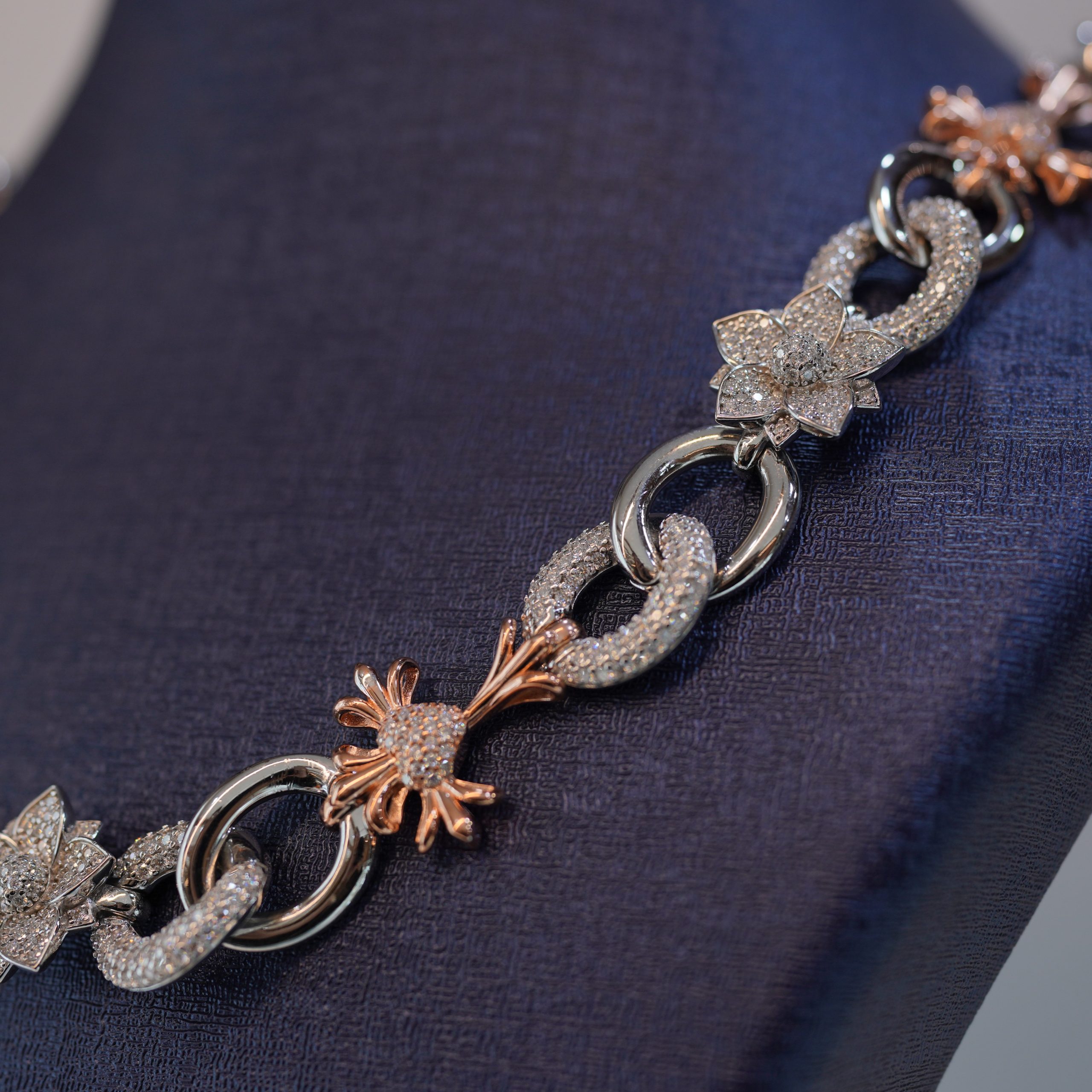 This masterfully designed Diamond Dancing Signature Chain embodies luxury and creativity in every detail. The necklace showcases a stunning two-tone fusion of silver, gold, and rose finishes, highlighted by intricate flower motifs and bold interlocking links. The centerpiece proudly displays the engraved Diamond Dancing logo, surrounded by VVS D-color moissanite stones that pass the diamond tester, ensuring maximum sparkle and authentic diamond-like fire. Each link is precision-set and polished to perfection, creating a striking piece that blends artistry with strength. A true statement of identity, elegance, and confidence — exclusively crafted by Dreams Jewelry & Diamond Dancing.