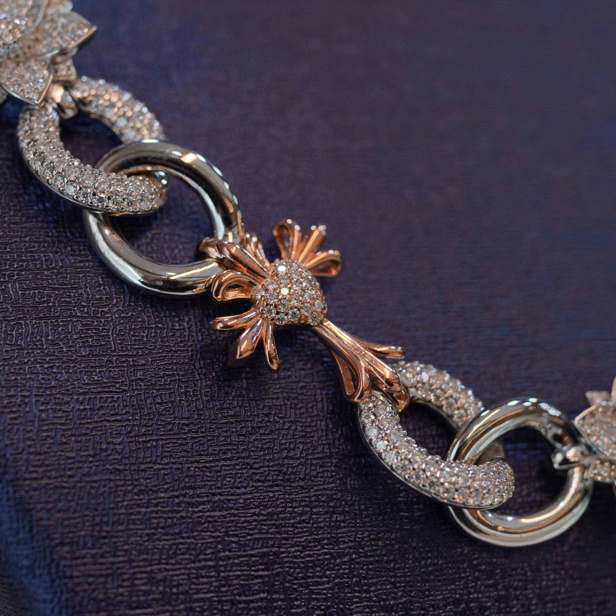 Luxury two-tone moissanite chain featuring custom Diamond Dancing centerpiece, yellow flower and rose accents. Each link is fully iced with VVS D-color moissanite stones that pass the diamond tester, radiating bold brilliance and craftsmanship.