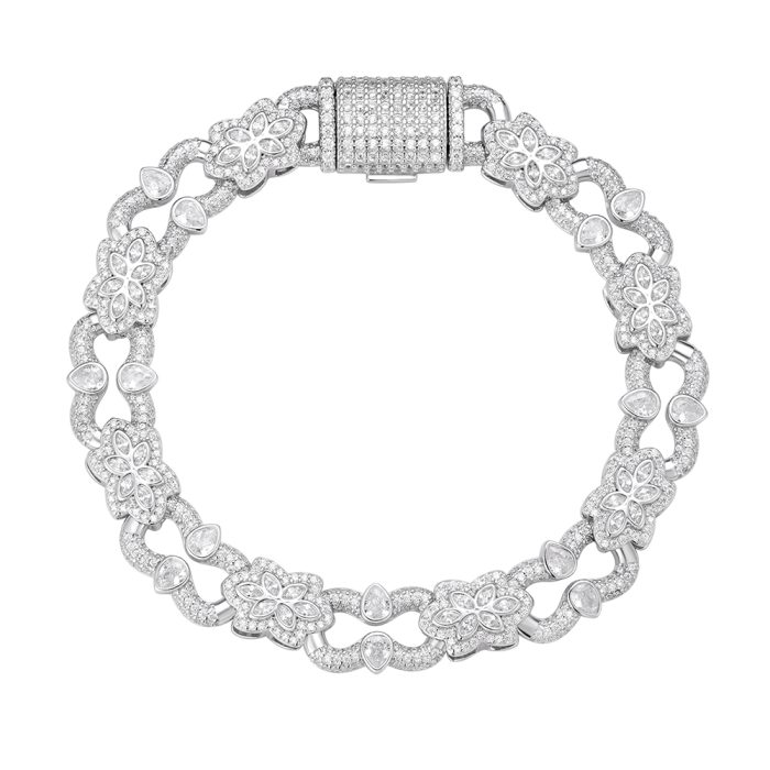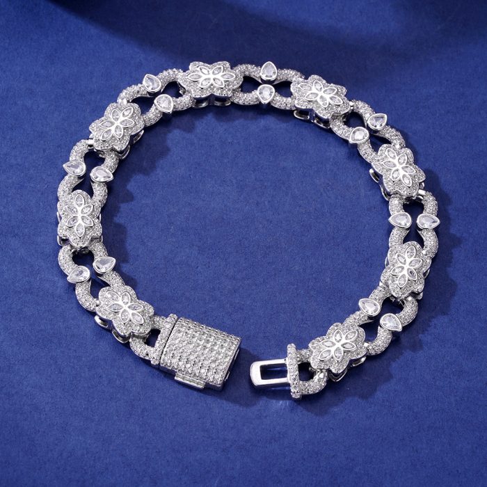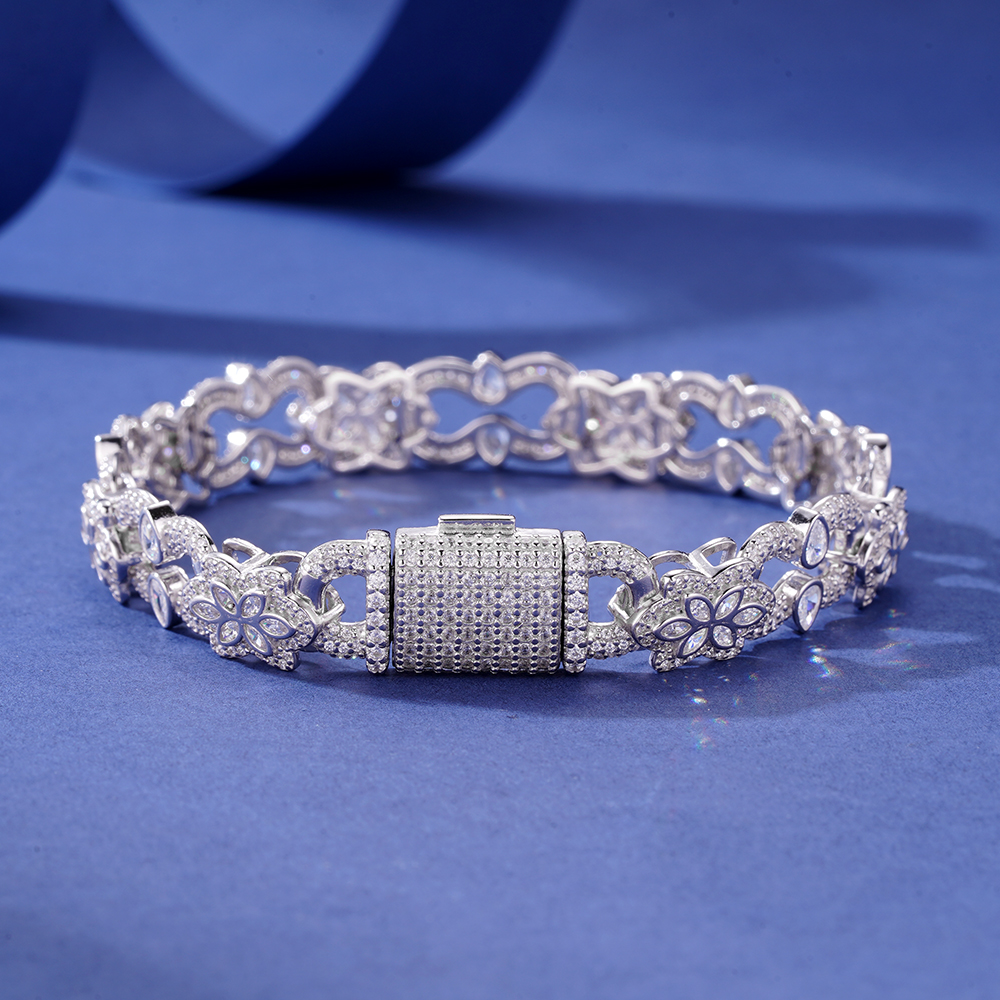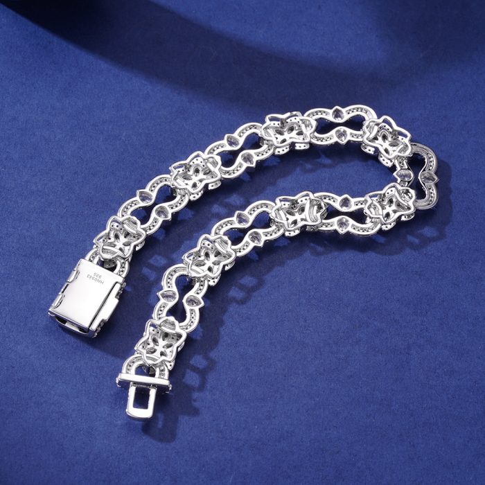 This elegant bracelet is crafted from 925K sterling silver and finished with high-quality rhodium plating for added shine and durability. It features a sophisticated combination of round, baguette, and unique eye drop-shaped VVS moissanite diamonds, arranged to create a balanced and luxurious aesthetic. Every stone sparkles with D-color brilliance and is guaranteed to pass the diamond tester.
