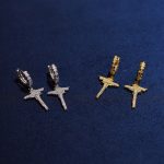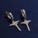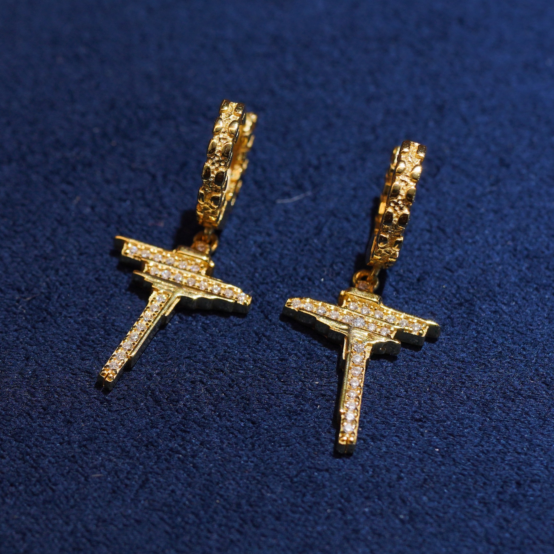 this earrings are dangle cross hoop earrings, featuring a small huggie-style hoop with a hanging cross pendant.