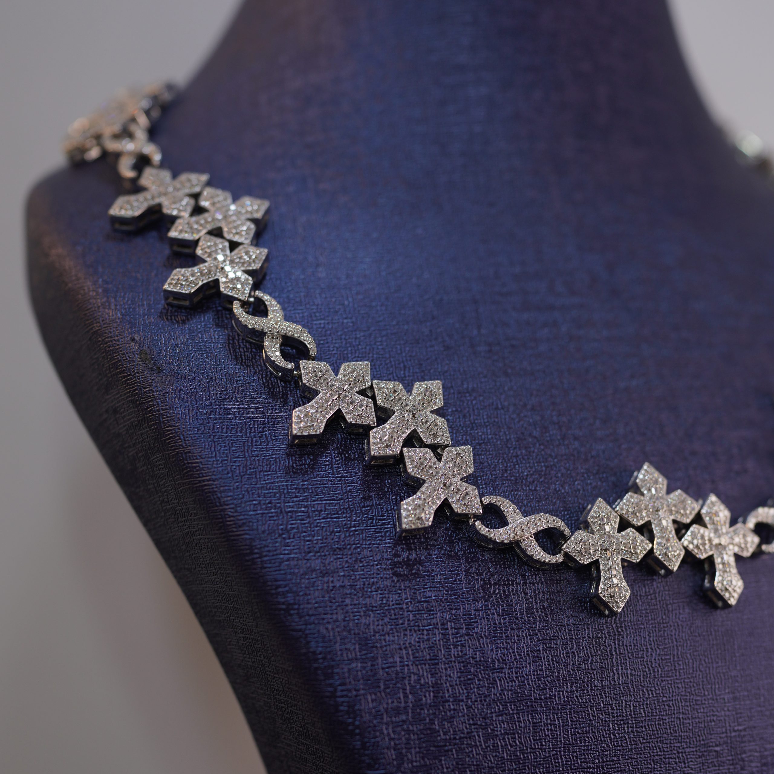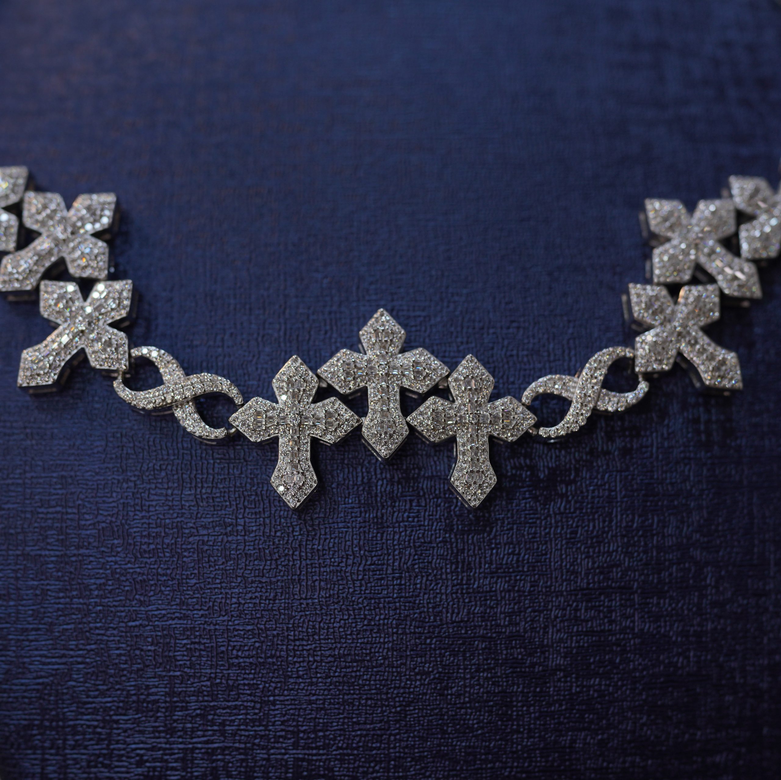 This Diamond Dancing cross-link moissanite necklace crafted in 925 sterling silver. Each piece passes the diamond tester, ensuring genuine brilliance and luxury shine. showcases a refined series of cross motifs, each intricately set with VVS D-color moissanite stones that radiate exceptional sparkle and clarity. Expertly crafted from solid 925 sterling silver, it embodies strength, faith, and timeless style.