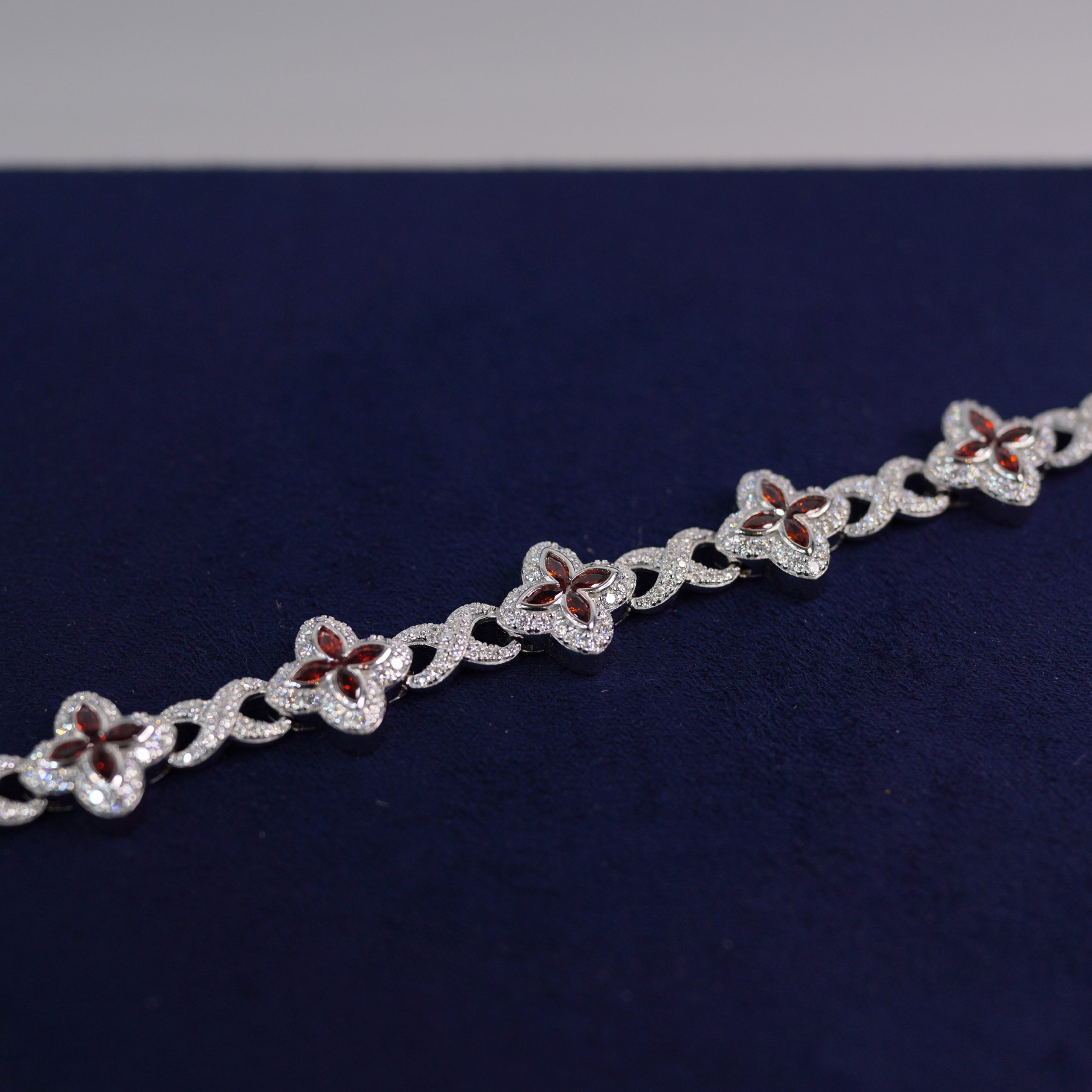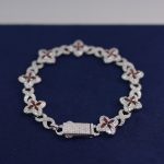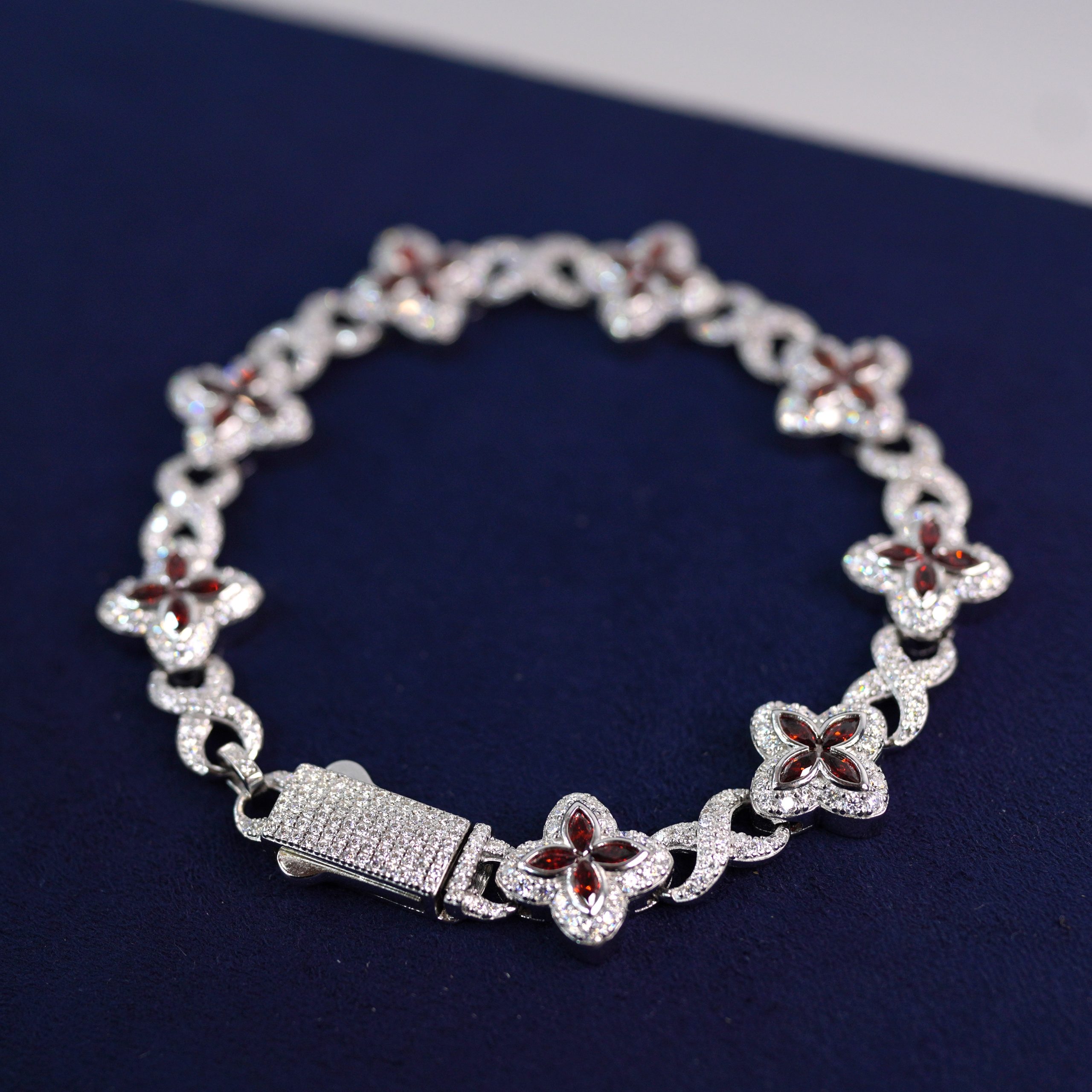 This beautiful bracelet features a unique chain of flower-shaped links, each center set with deep red stones surrounded by brilliant VVS moissanite. The contrast between the red petals and the icy moissanite creates a rich, luxurious look that stands out instantly. Every stone is high-quality and passes the diamond tester, giving you real shine and real confidence. The clasp is fully iced as well, completing the piece with a flawless finish. With every movement, the bracelet glitters delicately, showing the signature Diamond Dancing effect. A perfect mix of elegance, femininity, and high-end craftsmanship.