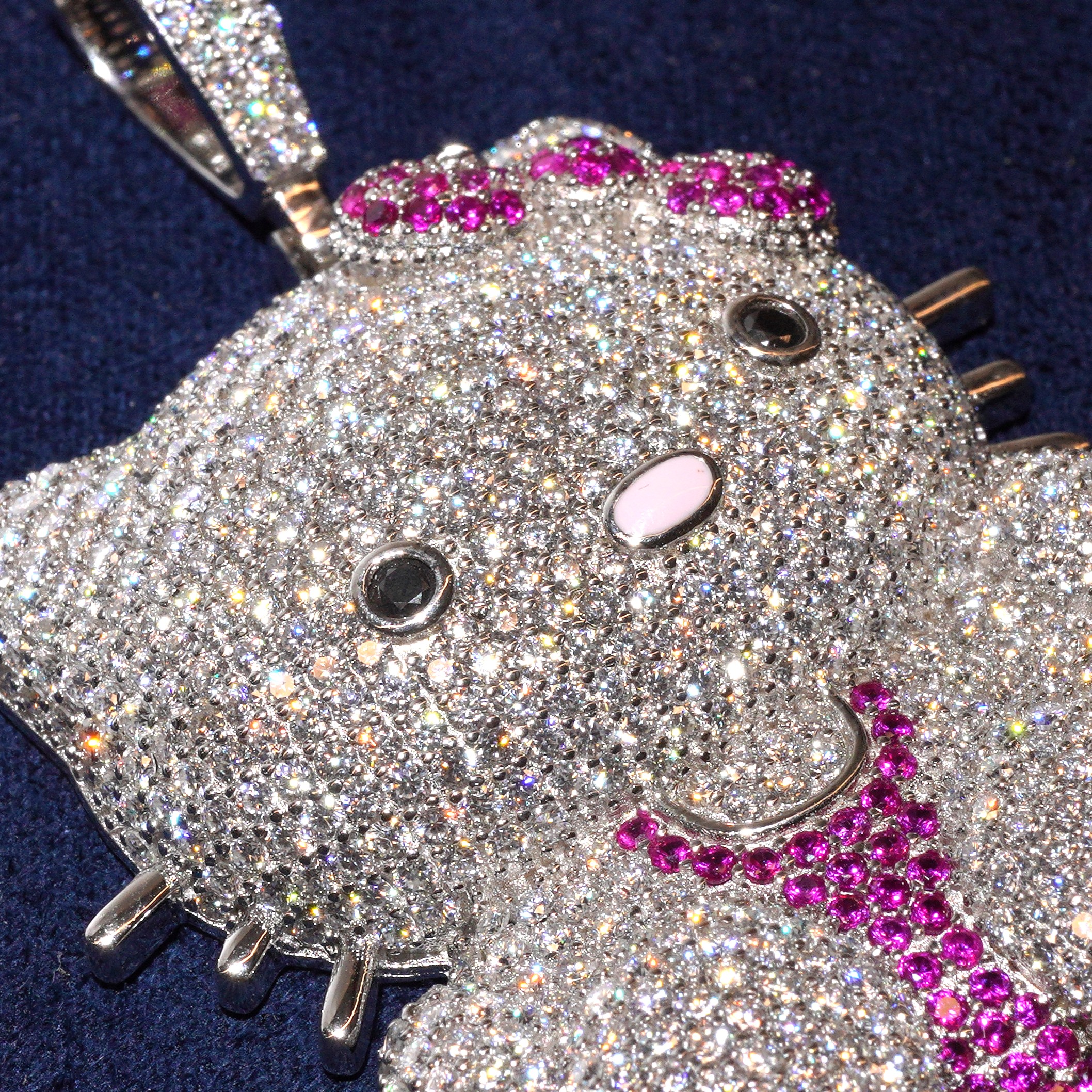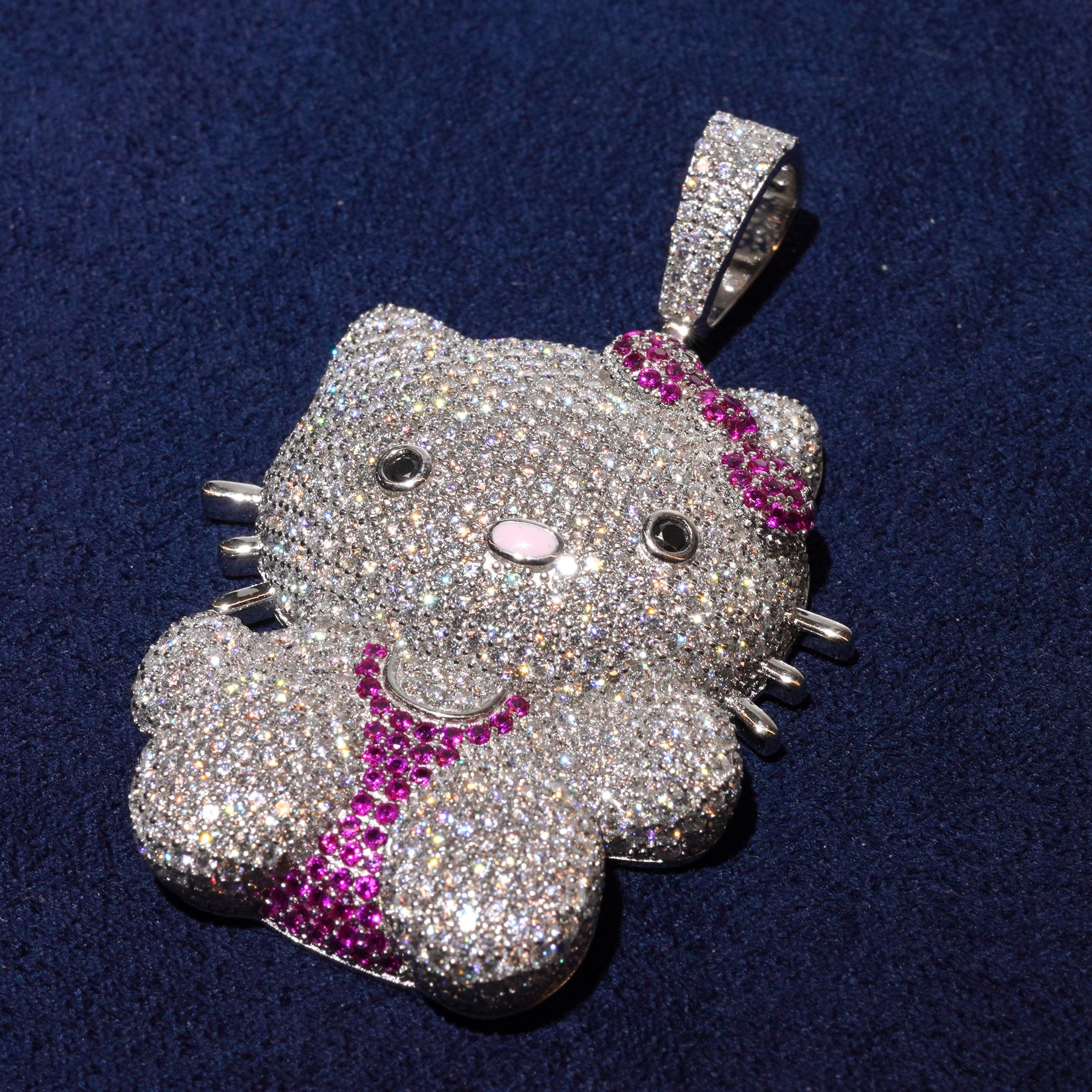 Iced-out Hello kitty Pendant crafted in 925 Silver with VVS Moissanite stones. Fully detailed with pink bow accents and a cute, luxurious shine. All stones are hand-set and pass the diamond tester. A perfect mix of playful and high-end style—Dreams Jewelry Diamond Dancing Collection.