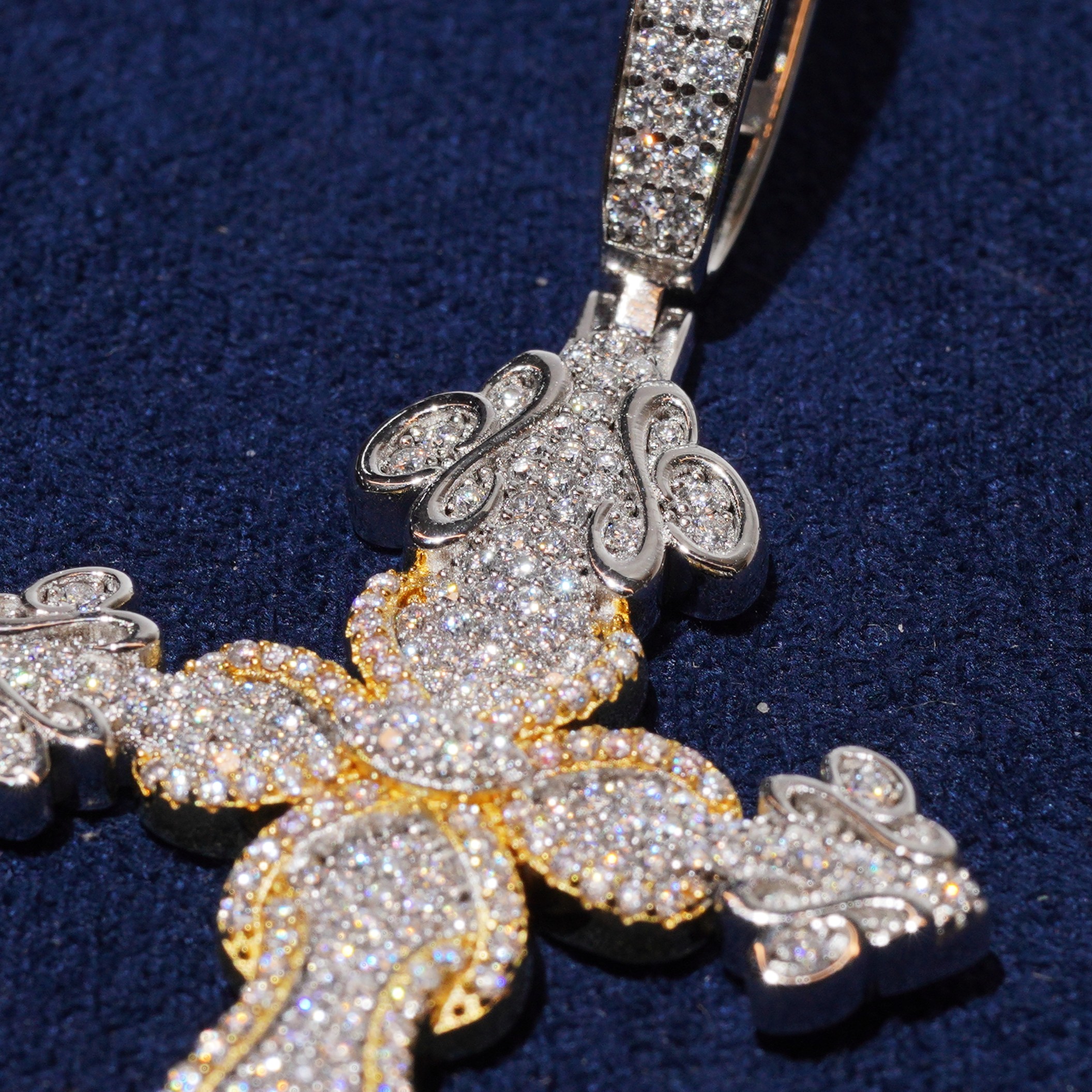 Iced-out 925K silver cross pendant featuring VVS Moissanite stones that pass the diamond tester. A luxury symbol of faith and protection from the Diamond Dancing collection.