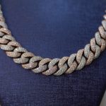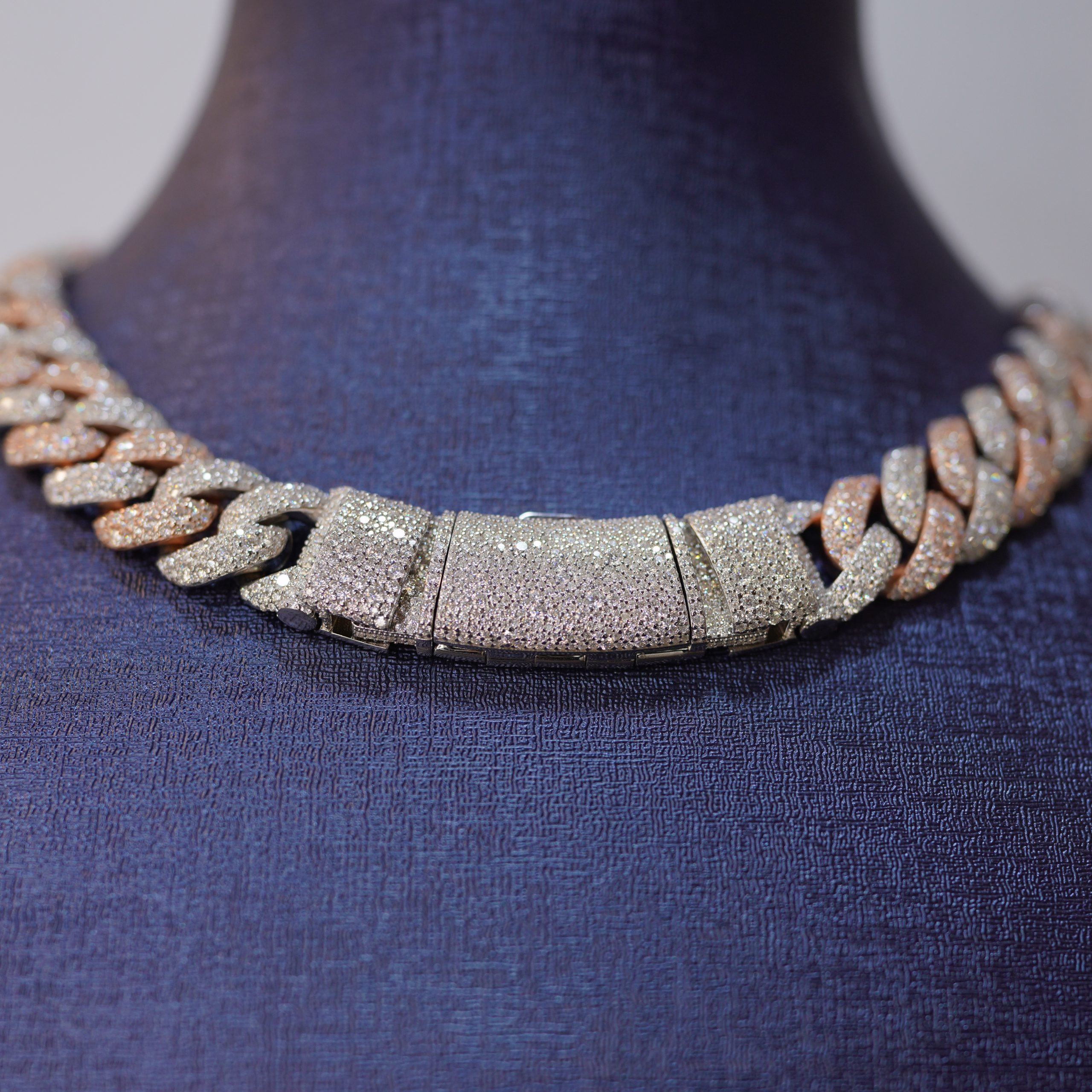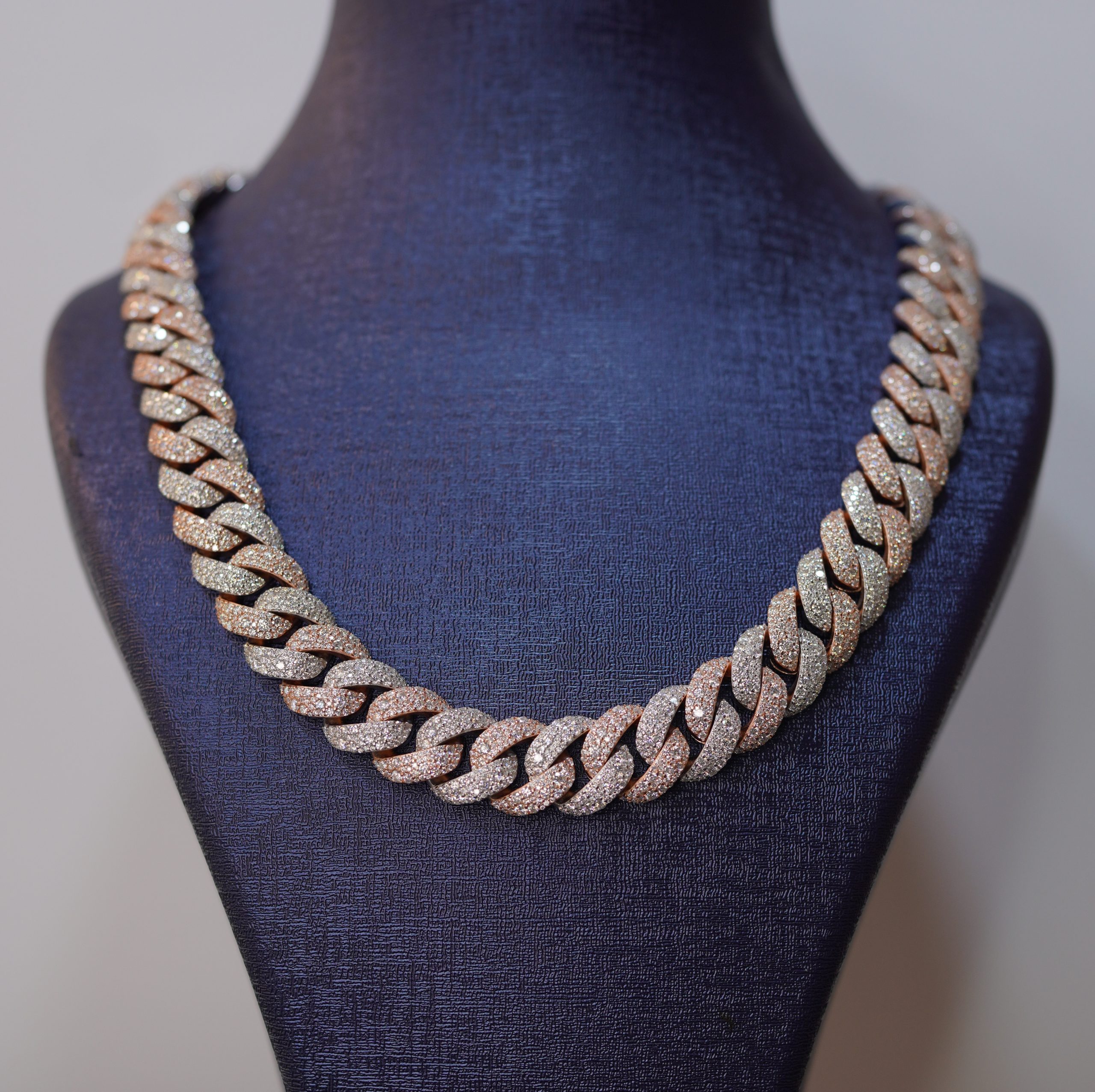 This premium Diamond dancing Two-tone Cuban link chain is crafted from high-quality 925 sterling silver and finished in a stunning two-tone mix of rose gold and white silver. Every link is fully handset with VVS moissanite stones, giving a powerful, high-end shine that confidently passes the diamond tester. The classic Cuban design sits smoothly on the neckline, reflecting light from every angle to create the iconic Diamond Dancing sparkle. A bold, luxurious statement piece perfect for daily flex or special occasions.