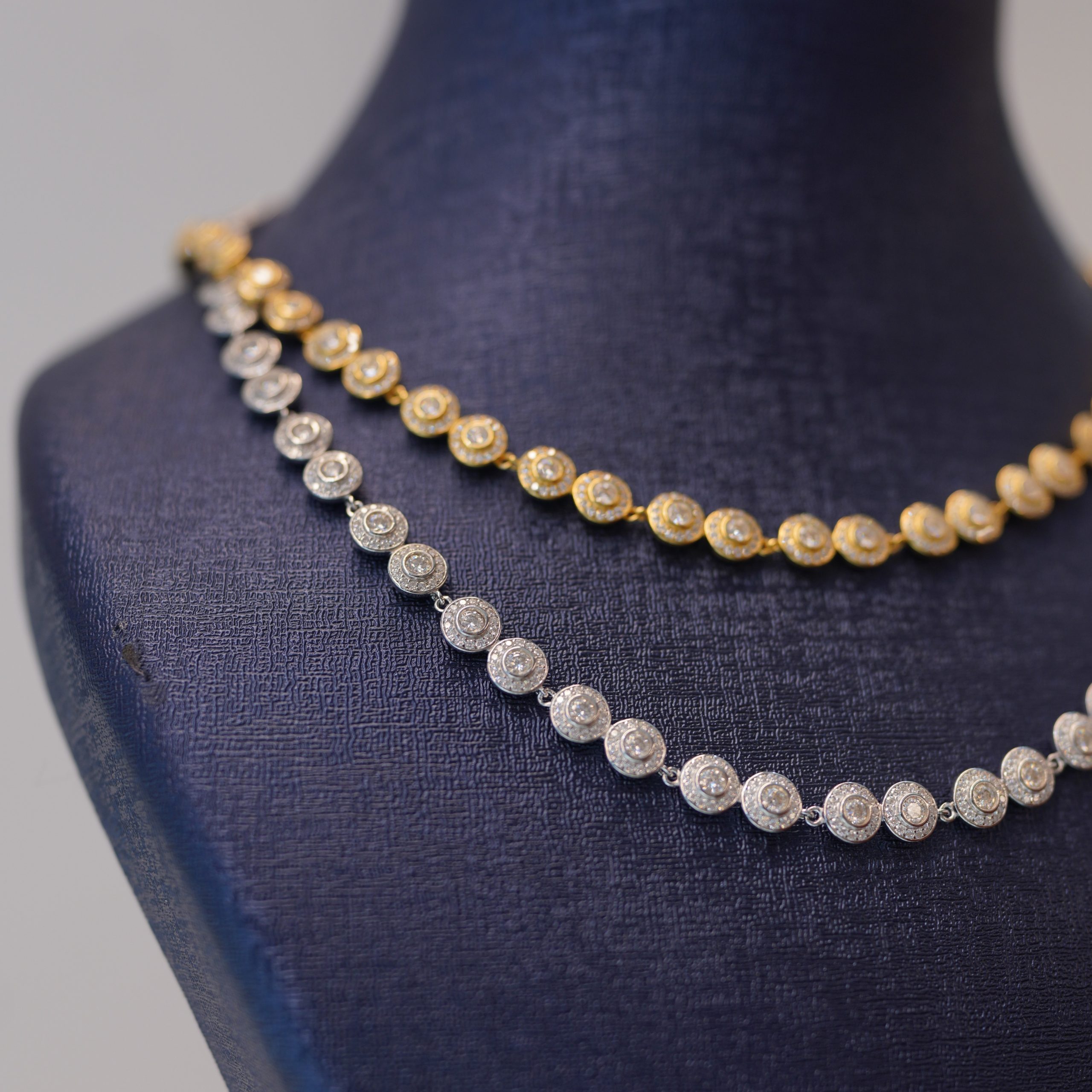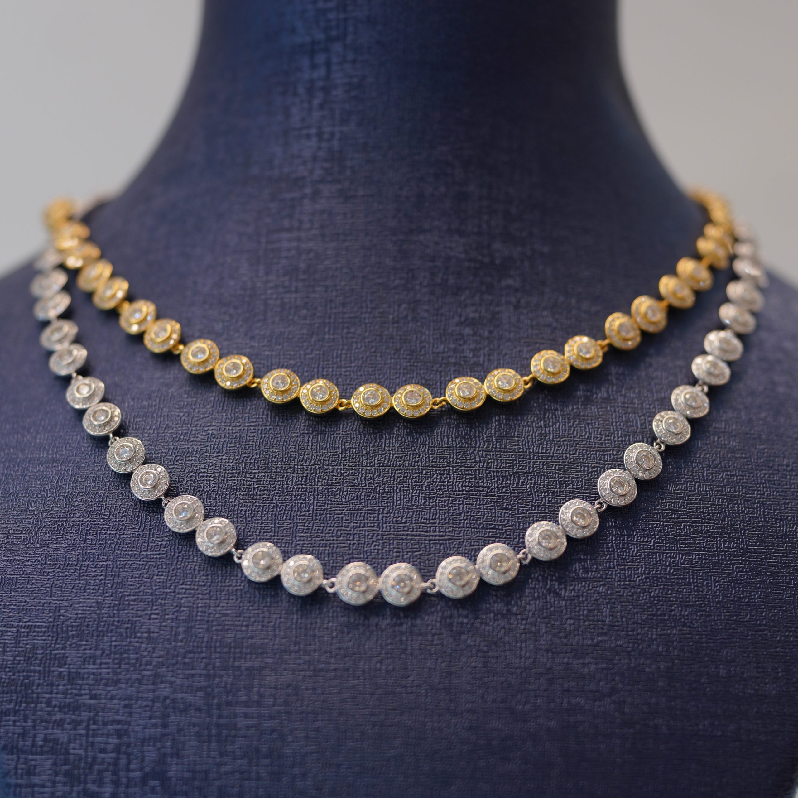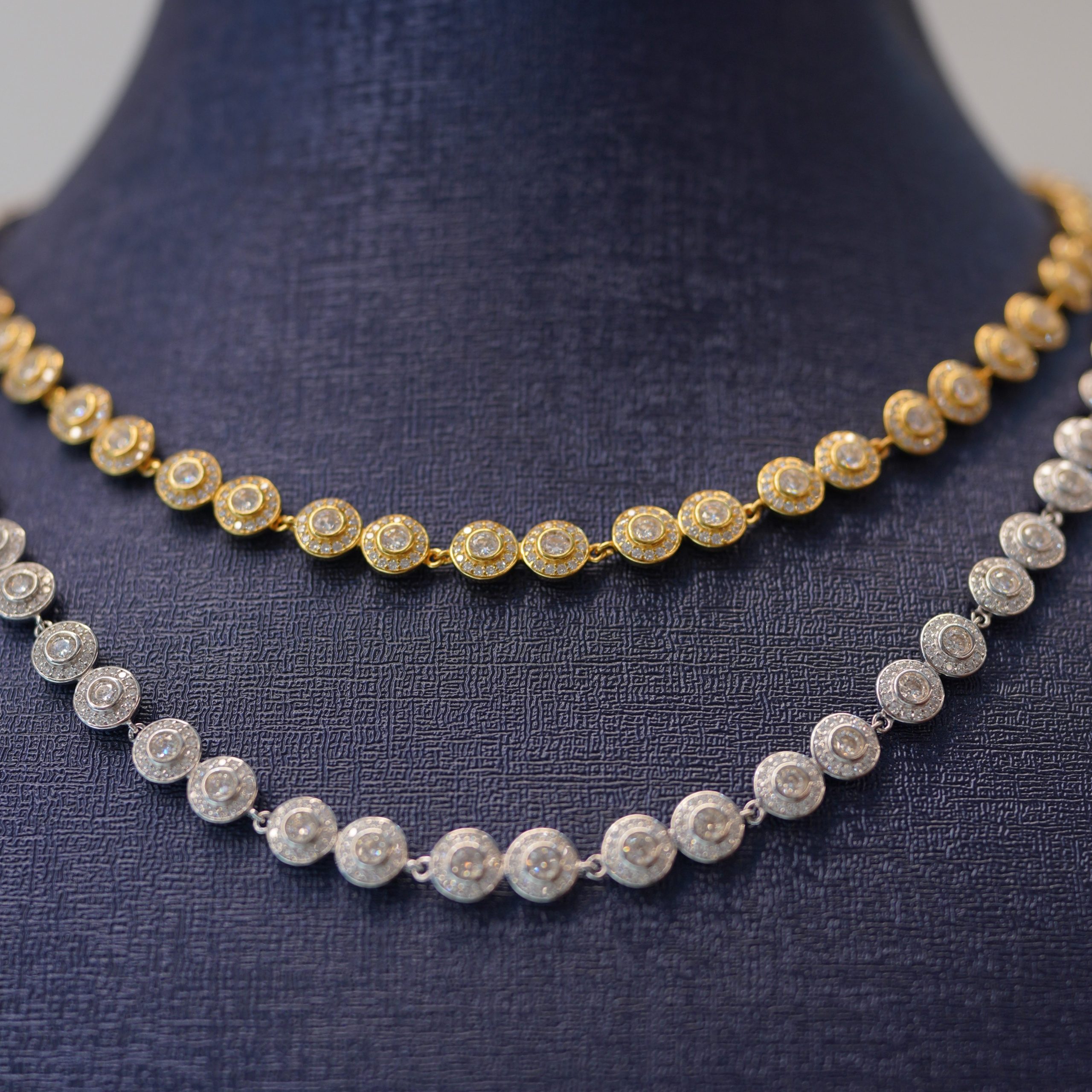 Elegant handcrafted necklaces featuring brilliant Diamond Dancing stones. Available in white and yellow tones, designed for everyday luxury or special occasions. Each piece passes the diamond tester and offers timeless shine.