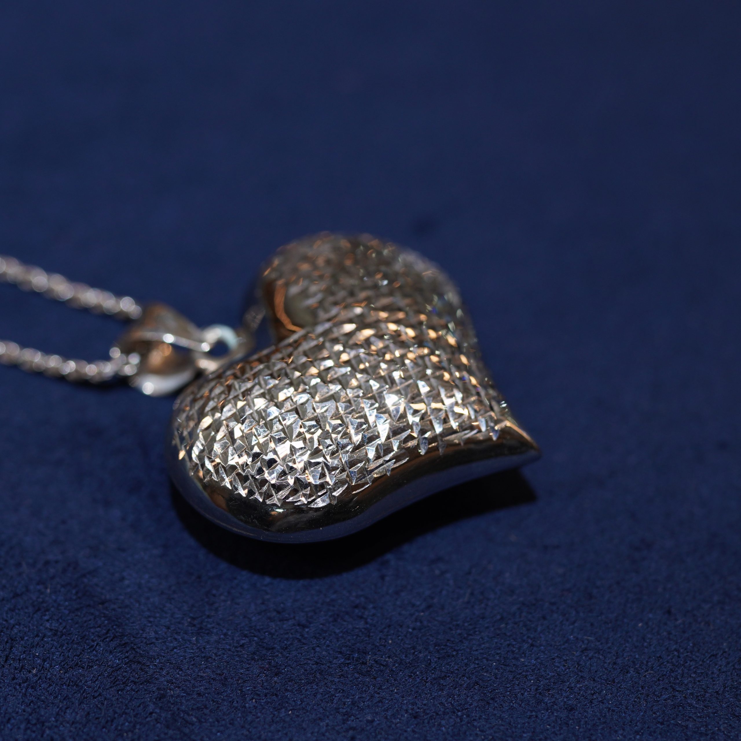 Elegant heart pendant with diamond-cut texture for natural sparkle. Timeless love design by Dreams Jewelry – Diamond Dancing.