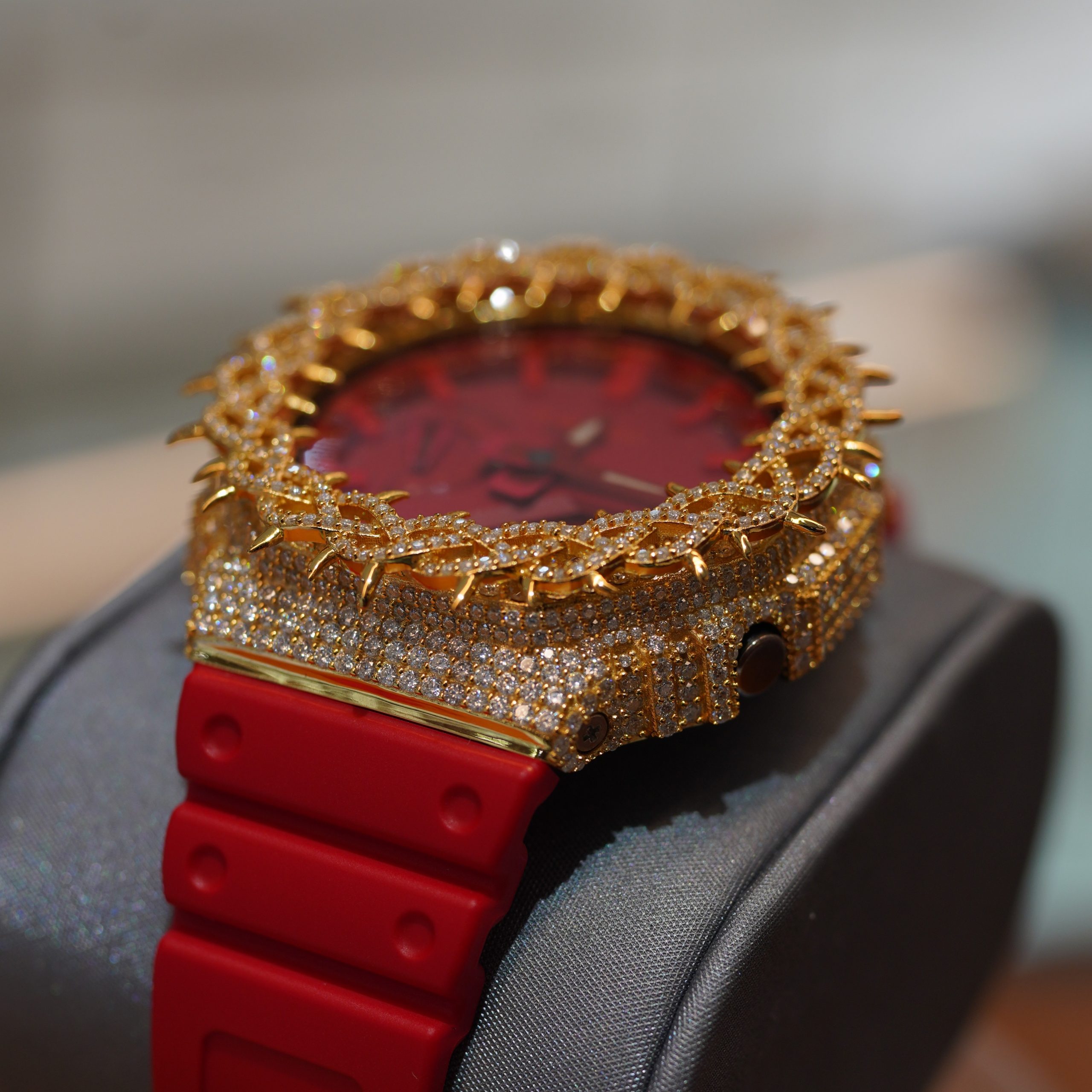 iced-out custom Casio G-Shock GA-2100. Featuring a unique thorn-style bezel and brilliant M VVS stones that pass diamond tests, this timepiece blends the legendary durability of a G-Shock with a bold, luxury aesthetic. The vibrant red rubber strap and matching dial complete the head-turning hip-hop style. Make a statement that’s built to last.