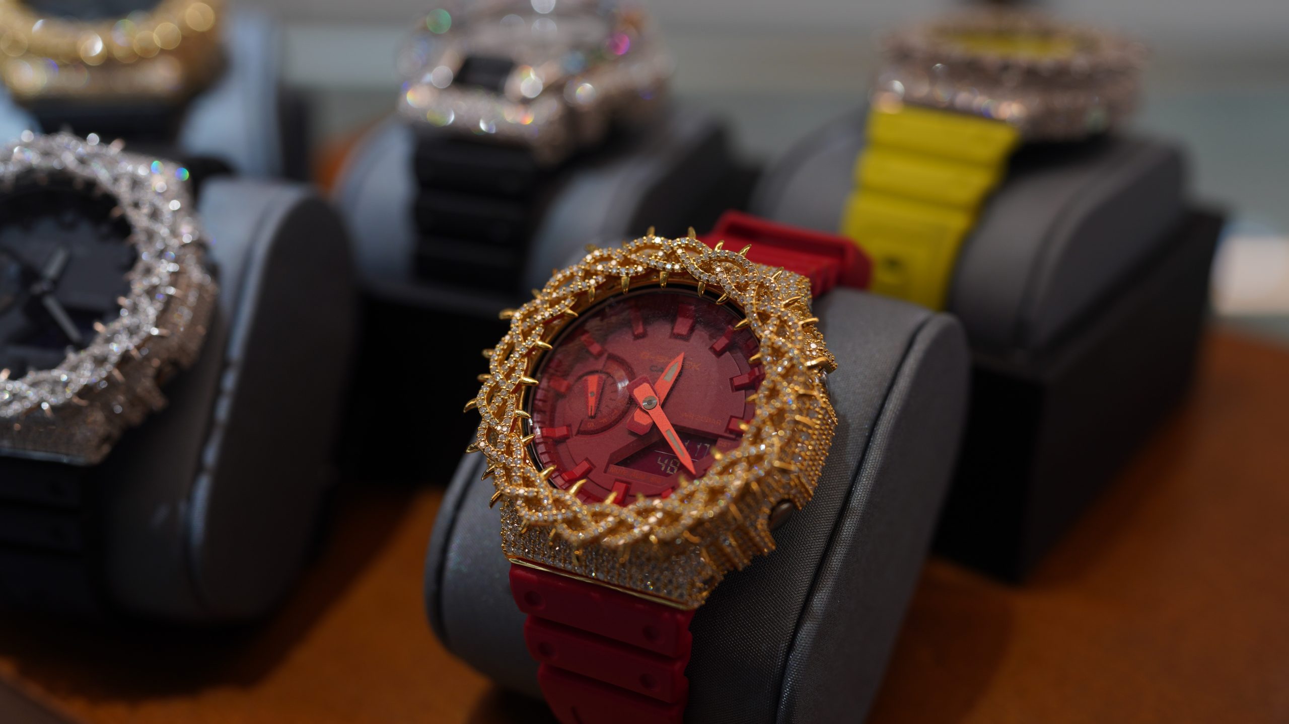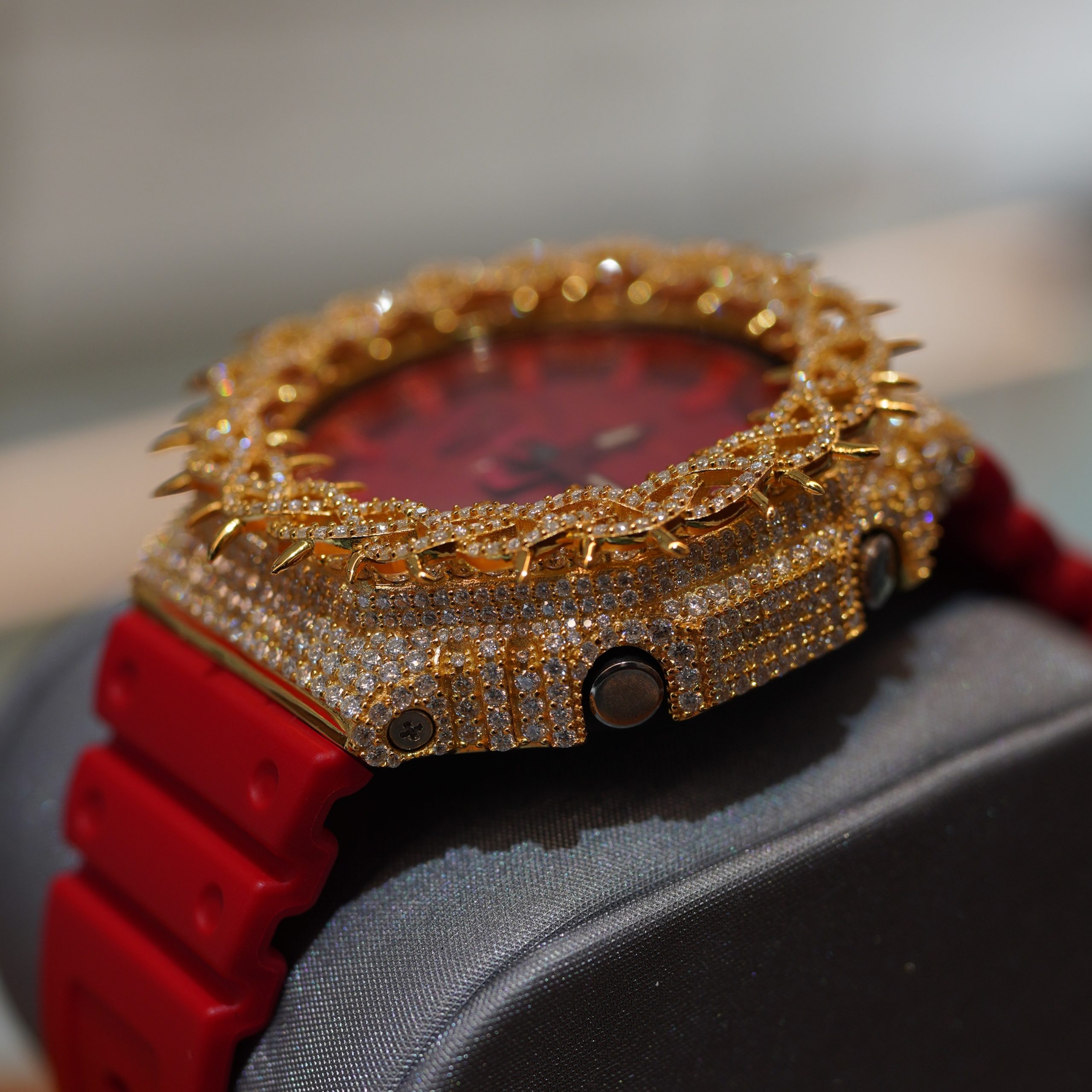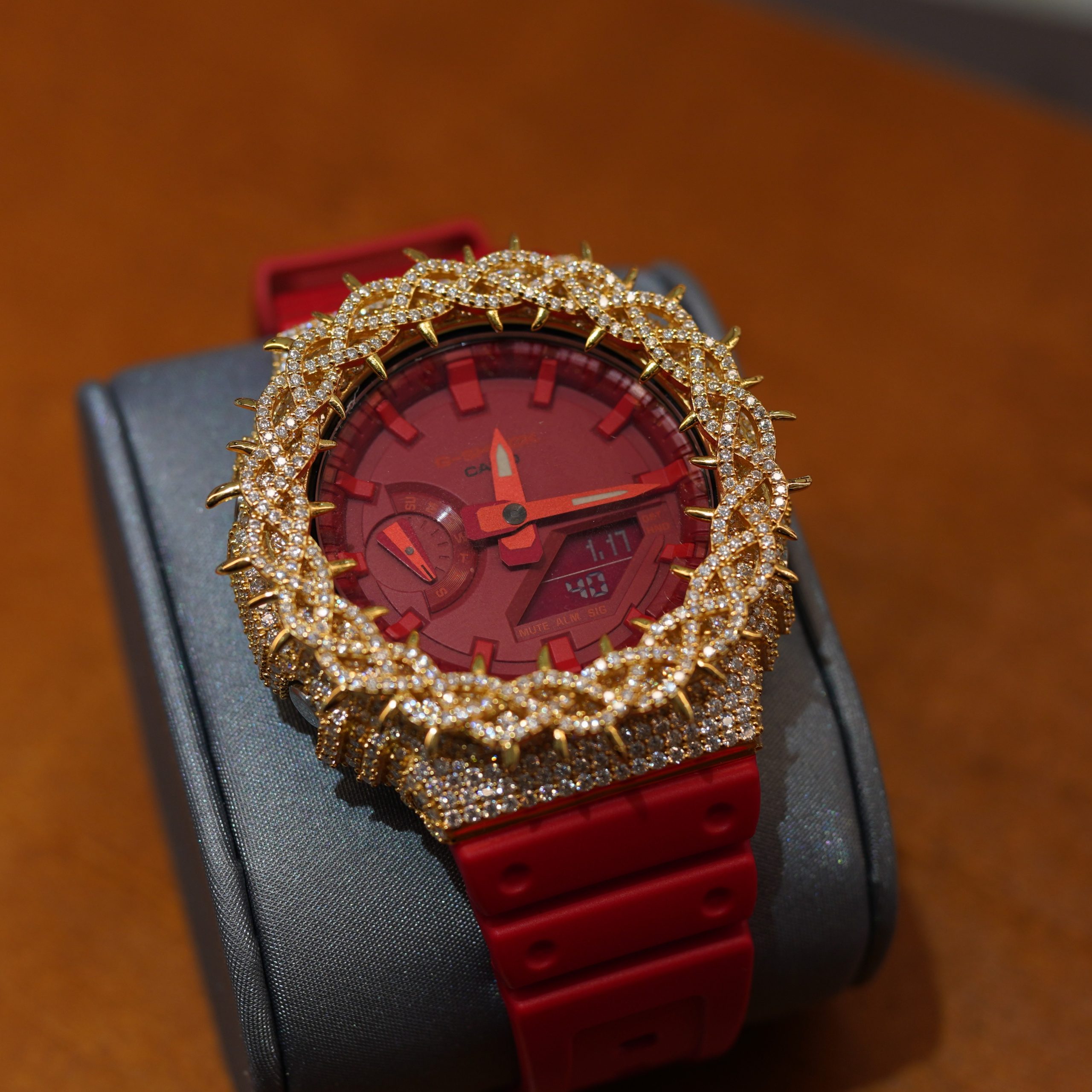iced-out custom Casio G-Shock GA-2100 red rubber strap