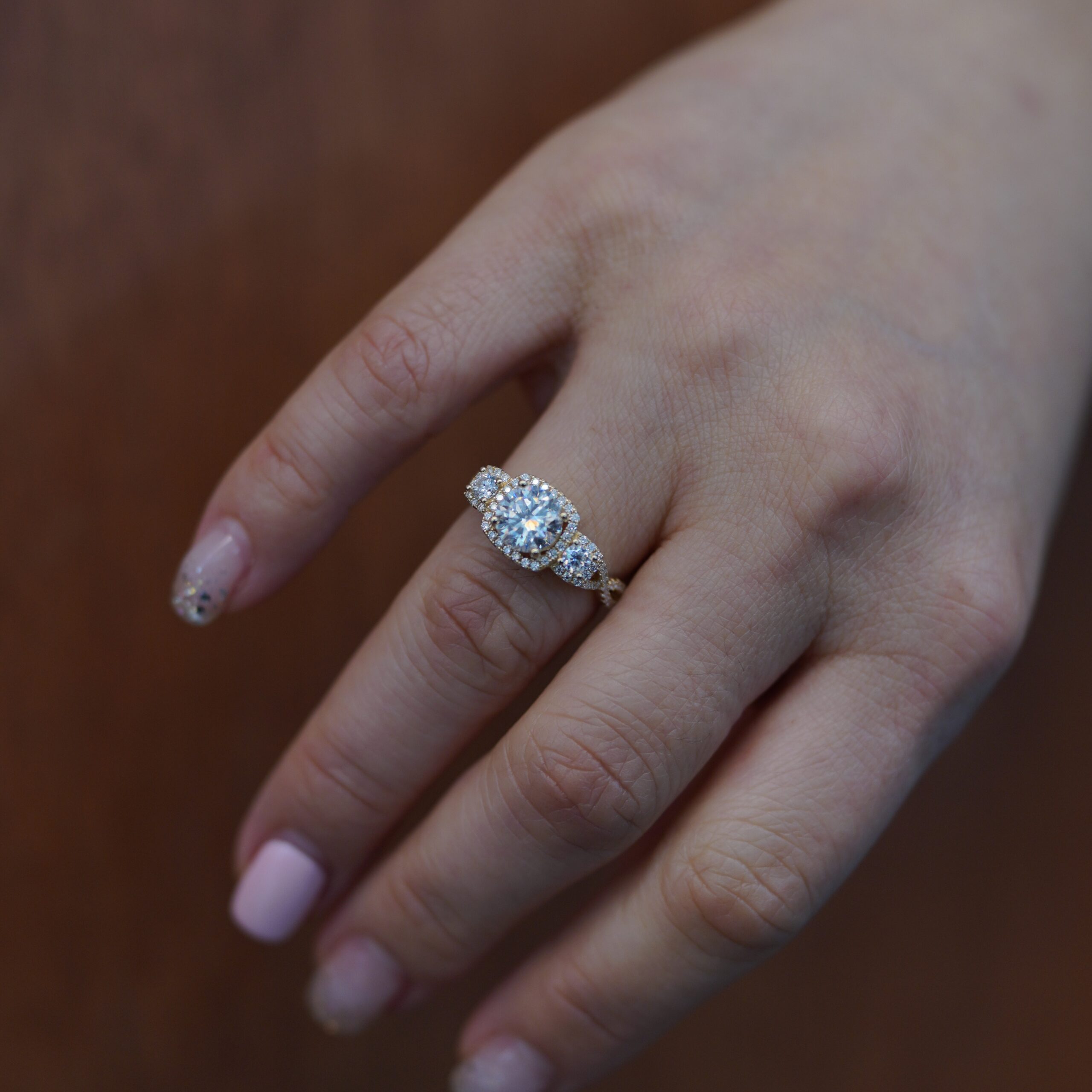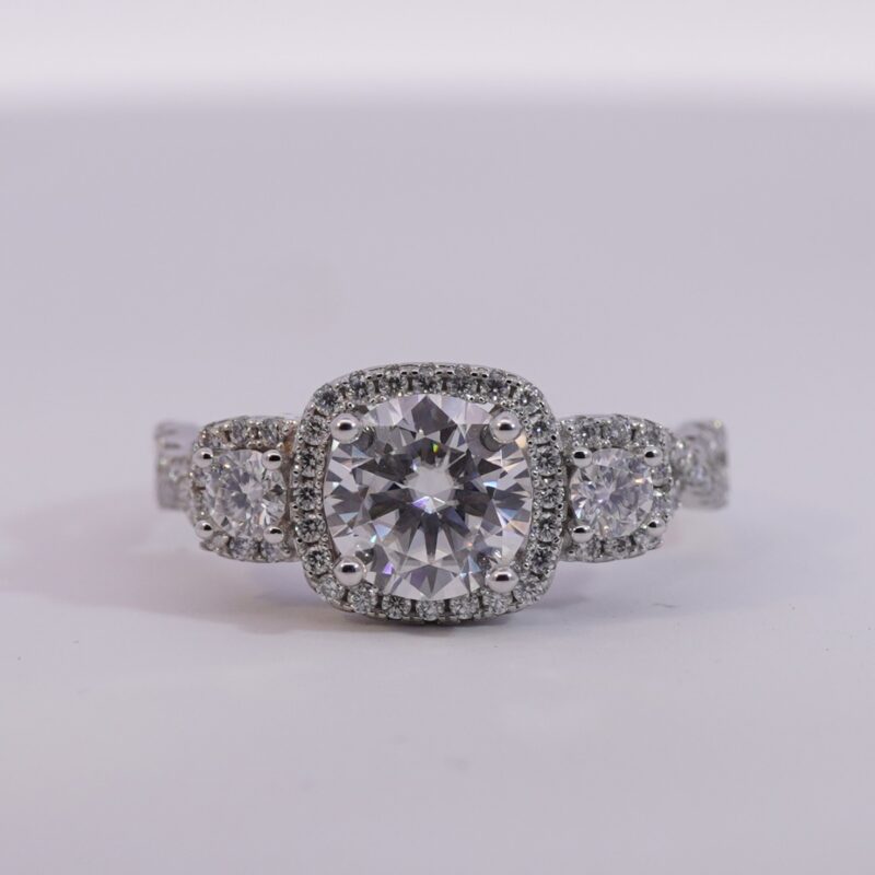 This exquisite three-stone engagement ring features a brilliant lab-grown center diamond framed by a shimmering cushion-shaped halo. Flanked by two matching side stones and set on a diamond-encrusted band, this ring represents your past, present, and future in 10k, 14k, or 18k gold. It is a timeless symbol of sustainable luxury and everlasting love.