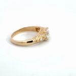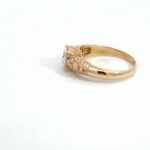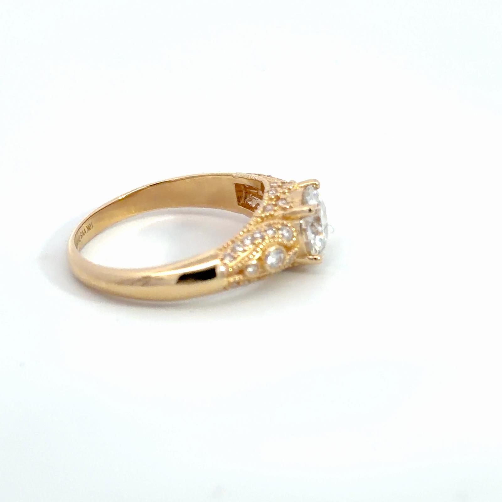 The band is beautifully detailed with pavé-set accent stones and intricate milgrain texture, creating a vintage-inspired yet luxurious finish. Crafted in a rich yellow gold tone, this ring perfectly balances bold presence with refined elegance.