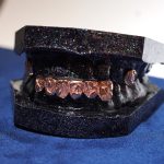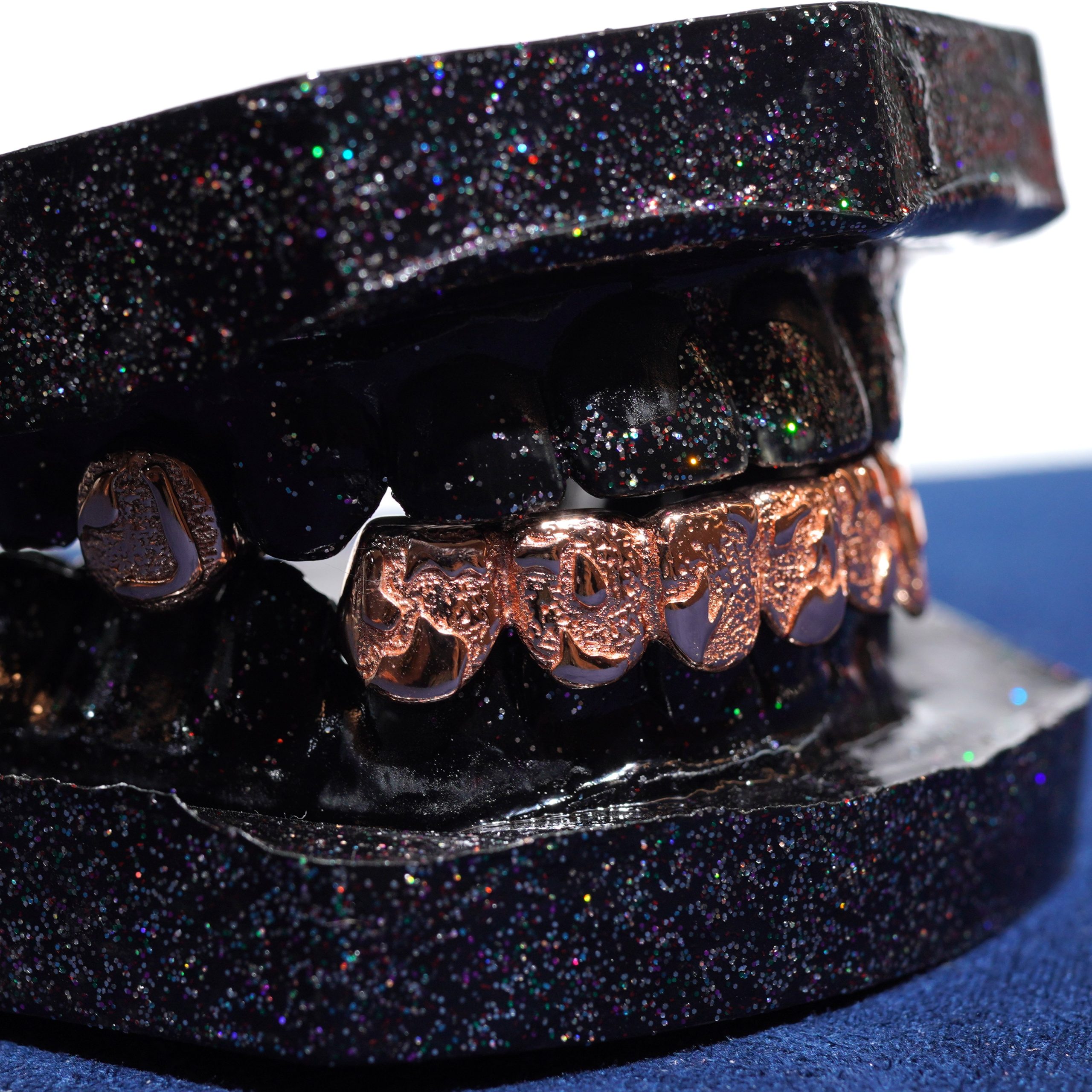 Rose Gold color Diamond Dancing Grillz — fully iced, premium craftsmanship, and passes the diamond tester. A bold luxury piece that transforms your smile instantly.