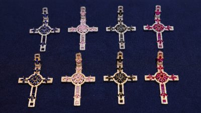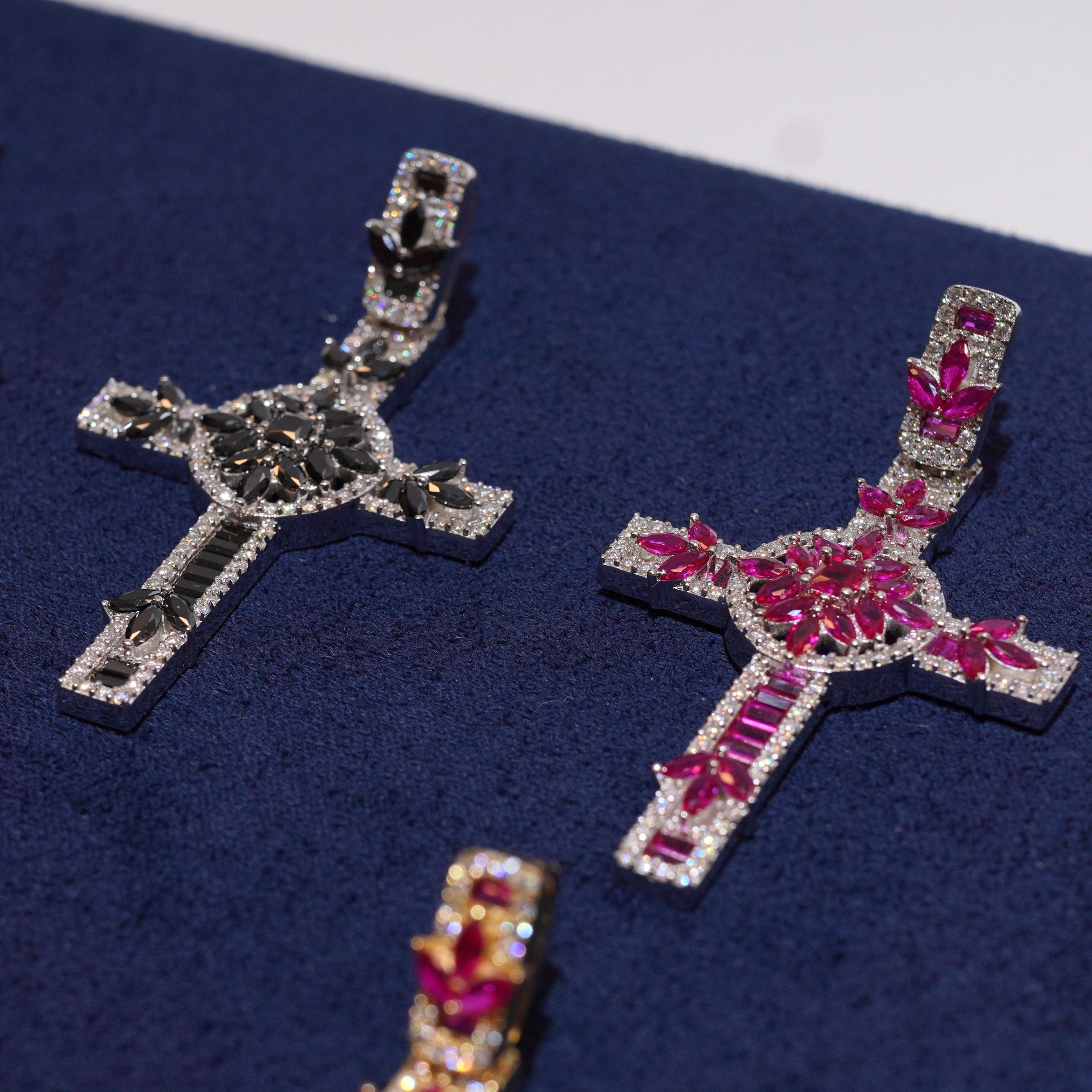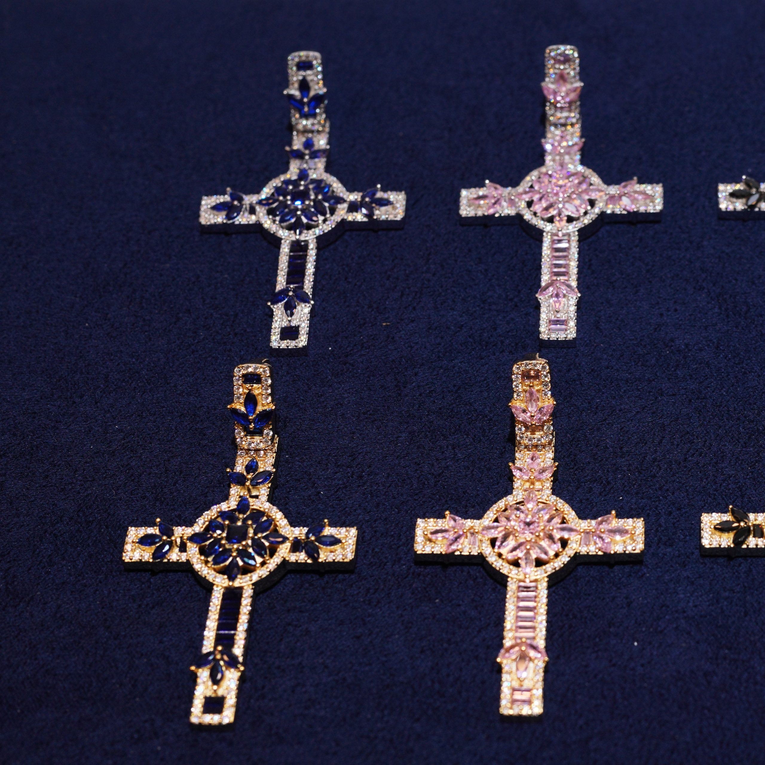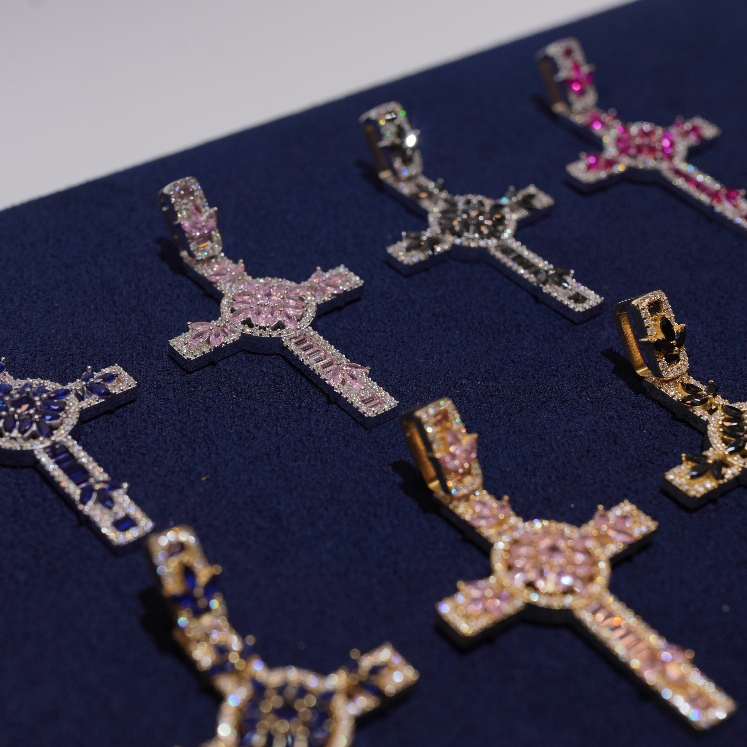 Luxury cross pendant fully iced with VVS moissanite stones. Available in multiple colorways. Premium shine by Dreams Jewelry – Diamond Dancing. Passes diamond tester.