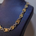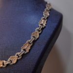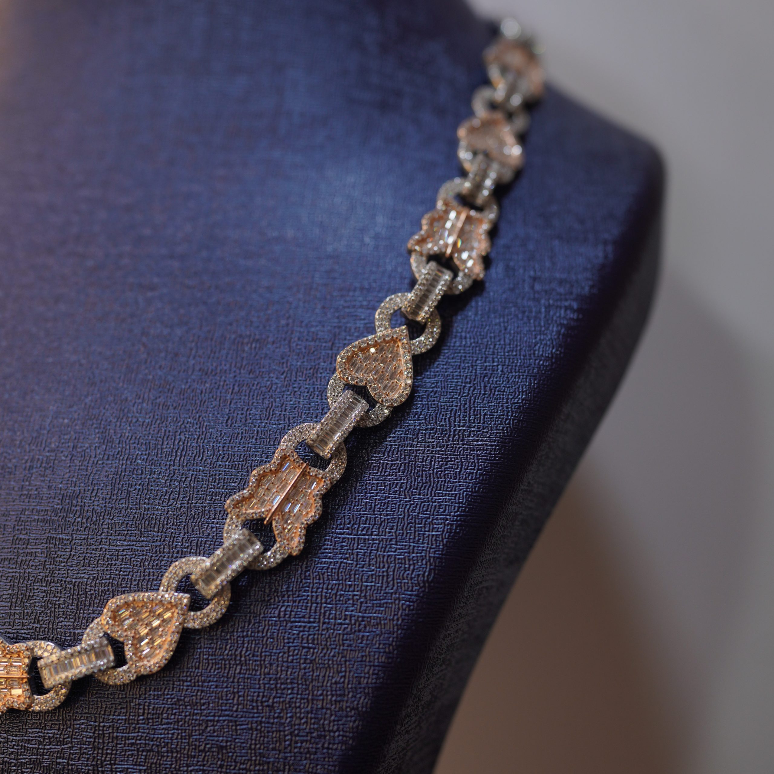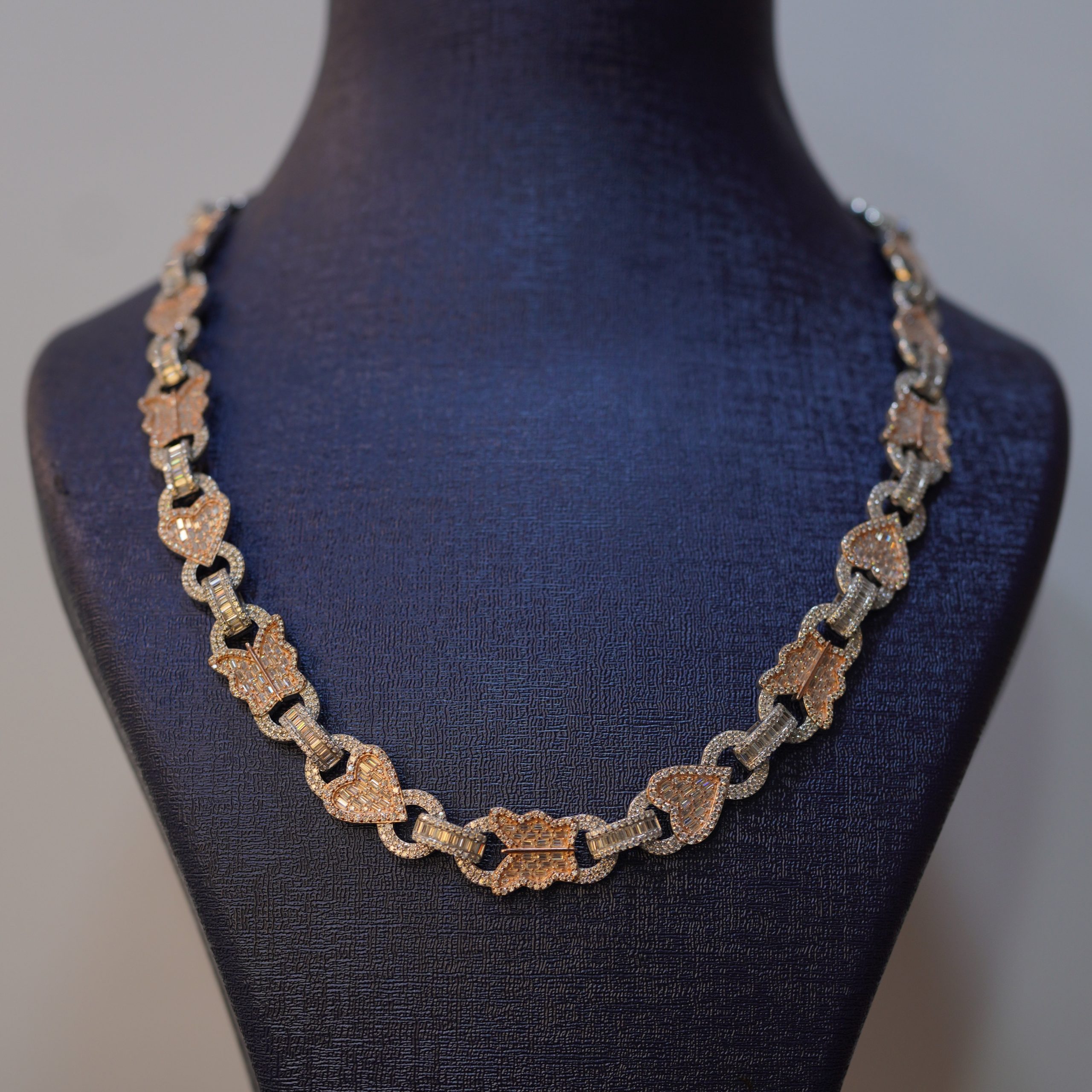 This premium two-tone iced link necklace is crafted from high-quality 925 sterling silver, designed with alternating yellow-gold and rose-gold tone motifs for a rich, standout look. Each link is fully encrusted with brilliant VVS moissanite stones, guaranteeing exceptional sparkle and confidently passing the diamond tester. The smooth, interlocked structure sits comfortably around the neckline, catching light from every angle and creating the signature Diamond Dancing effect. Combining luxurious craftsmanship with modern style, this necklace makes a powerful statement for any occasion.